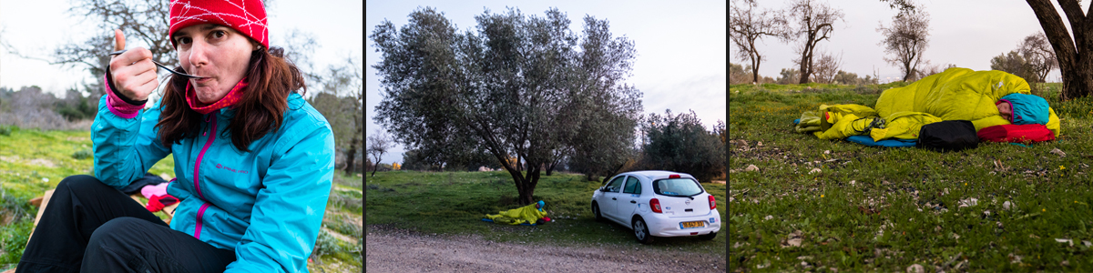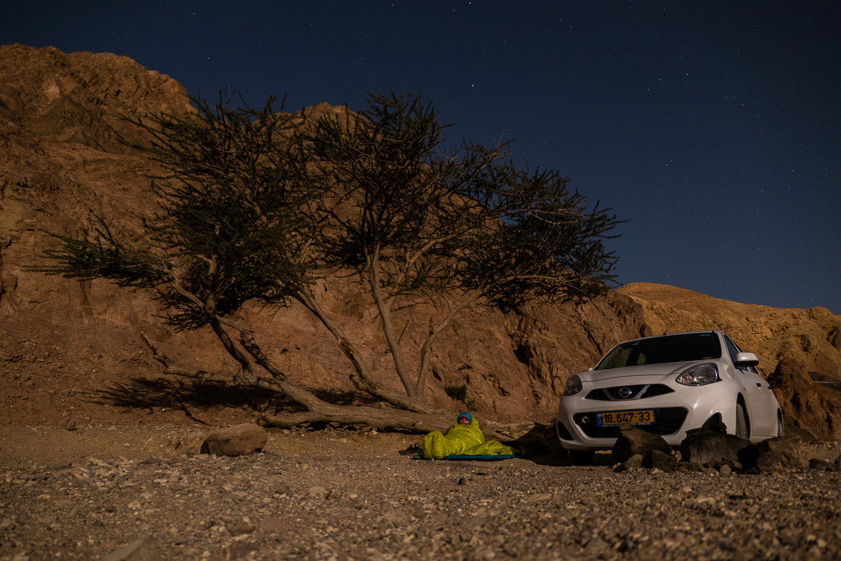 Uložili sme sa priamo v parku s výhľadom na kolóny svetiel smerujúcich do Tel Avivu. Zaklipkali mi oči, dokonalé ticho prerušovalo len občasné vytie šakalov. V jeden moment som sa díval na hviezdy a v druhý tvrdo spal. Neviem koľko to trvalo, ale zobudil som sa na to, že sa mi niečo vlhké obtiera o ruku. Čože? Precitnem a fakt. 30 centimetrov odo mňa vidím dve svietiace oči! Áááá, výkrik sa mi z hrdla vydral automaticky. "Dašena, do auta!", lomcujem žltou húsenicou spiacou vedľa na karimatke.