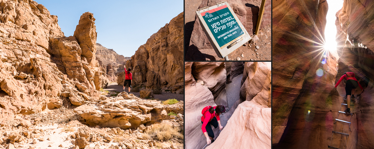 Po ceste späť do Eilatu sme si strihli známu atrakciu - Červený kaňon. Táto "hříčka" prírody priťahuje turistov rovnako účinne ako magnet železo a aj teraz sú ich tu plné autobusy. Preto sme si počkali na neskoré popoludnie, aby sa trocha vyprázdnilo a aby slnečné lúče zvýraznili červenú farbu skál. Prejsť kaňon je otázkou maximálne tridsiatich minút, ale aj tak sa to oplatí.