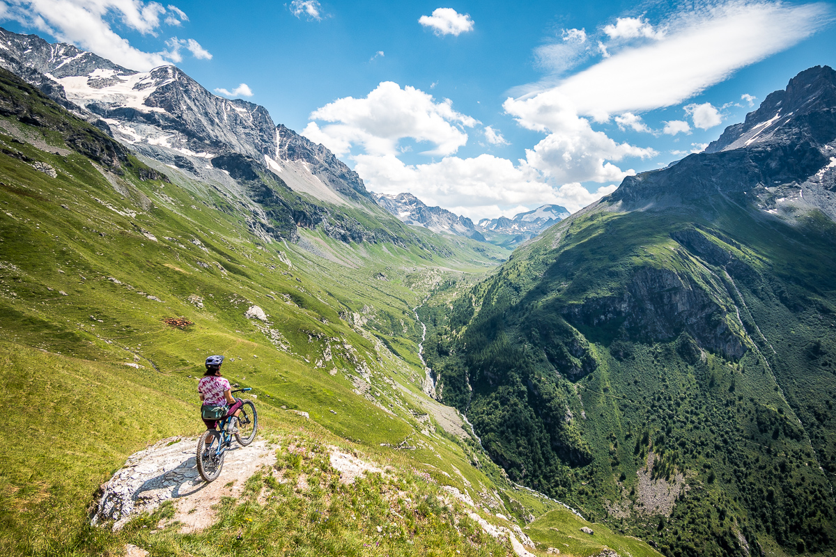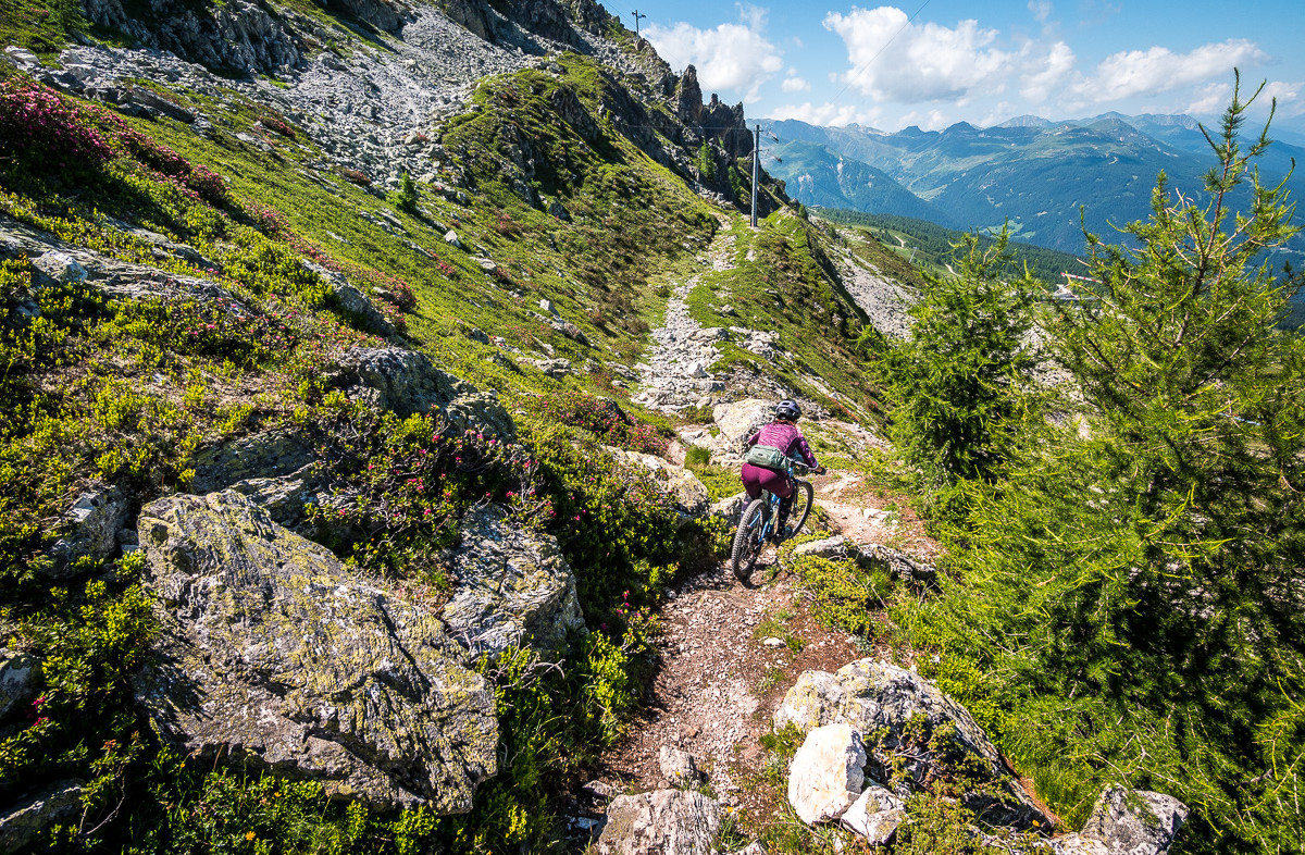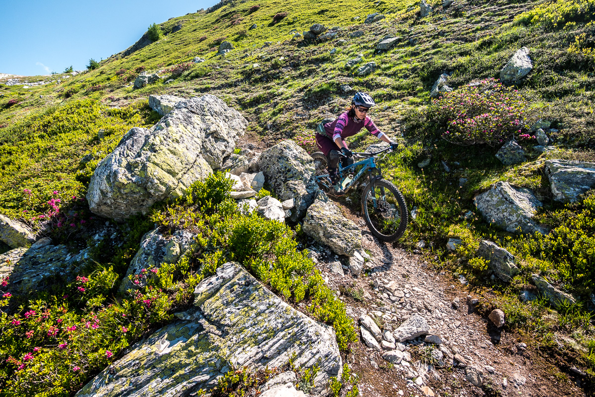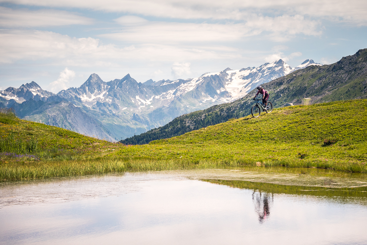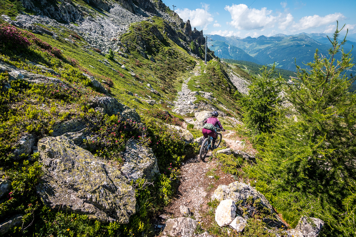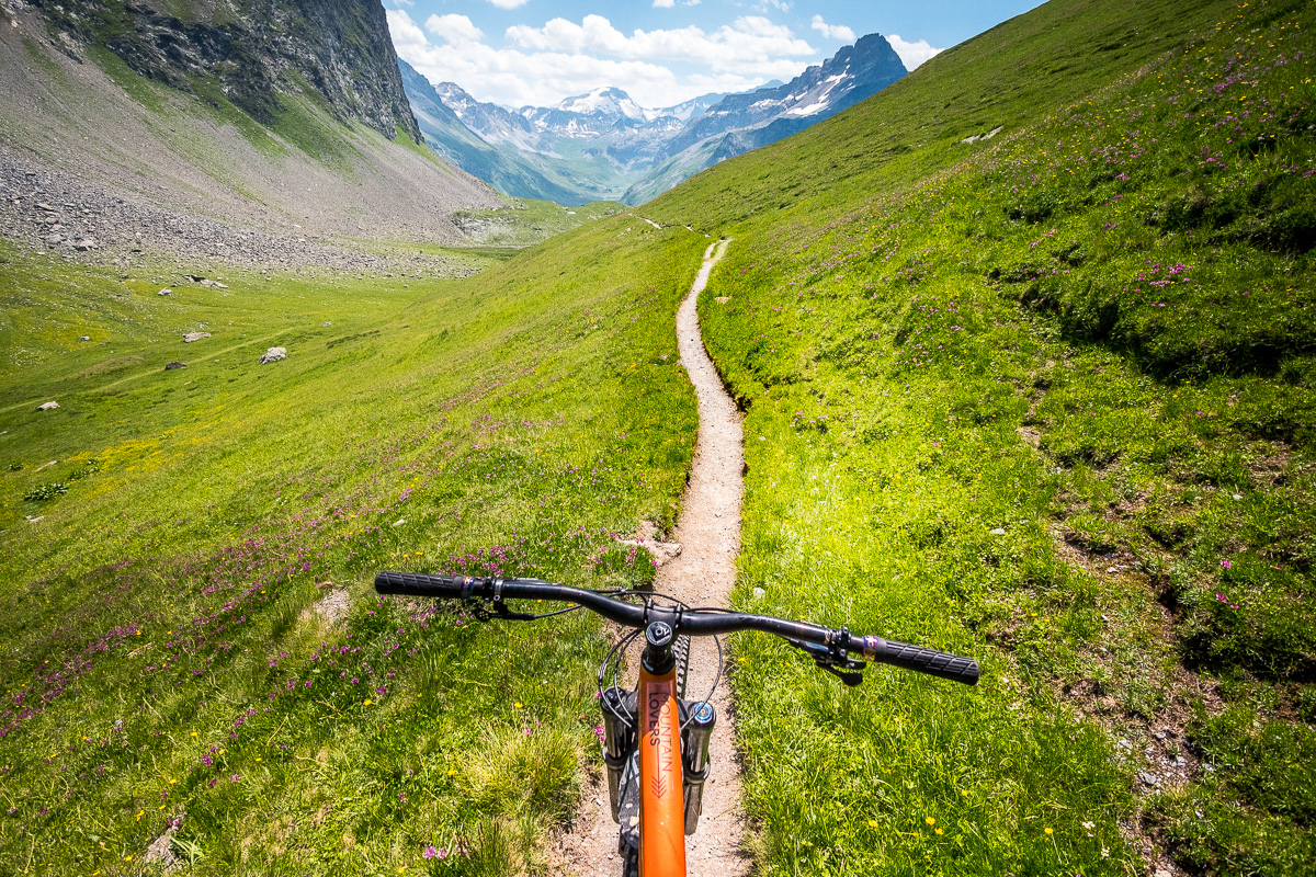 Kombináciou lanoviek a šotolinových výjazdov stúpame cez Col de la Chal a ďalej pešo, tlačíme bajky k modrému jazierku Lac des Moutons. Zrkadlia sa v ňom okolité štíty, voda sa ani nepohne. Scenérie hodné zastavenia a pikniku – len sedíme pri jazere, pozeráme do ticha hôr a v hlave to pomaly prepíname do bike módu. Pred nami sa totiž vinie nekonečne dlhá, úzka lajna, ktorá sa hadí cez alpské údolie a mizne niekde v diaľke, tam, kde sa hory ponárajú do obzoru. Úzky trail sa tiahne alpskou krajinou, chvíľu po hranách, chvíľu cez suťové polia a traverzy, ktoré sa strácajú v nekonečne. Každá zákruta je iná, terén sa mení s každým kilometrom, na niektorých miestach trail ostro klesá, inokedy nás nechá vydýchnuť na miernych traverzoch. Výhľady nás nútia spomaliť, ale flow nás nenechá stáť. A keď si myslíme, že to už máme za sebou, La Varda pokračuje ďalej, kým z nás nevytrasie aj posledné zvyšky energie. Toto je jednoducho to, prečo to robíme. Hory, ticho, surovosť. Čistá esencia bajkovania.