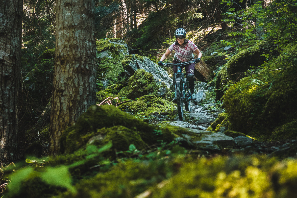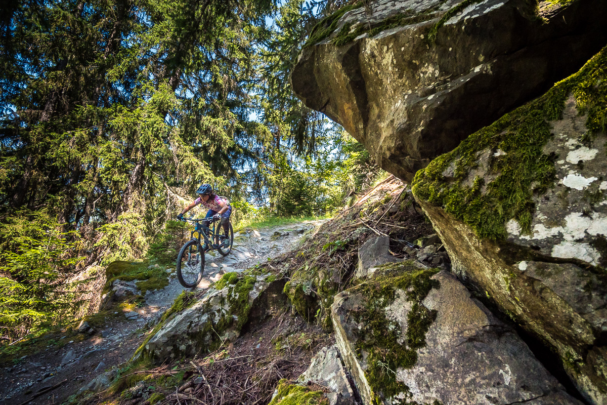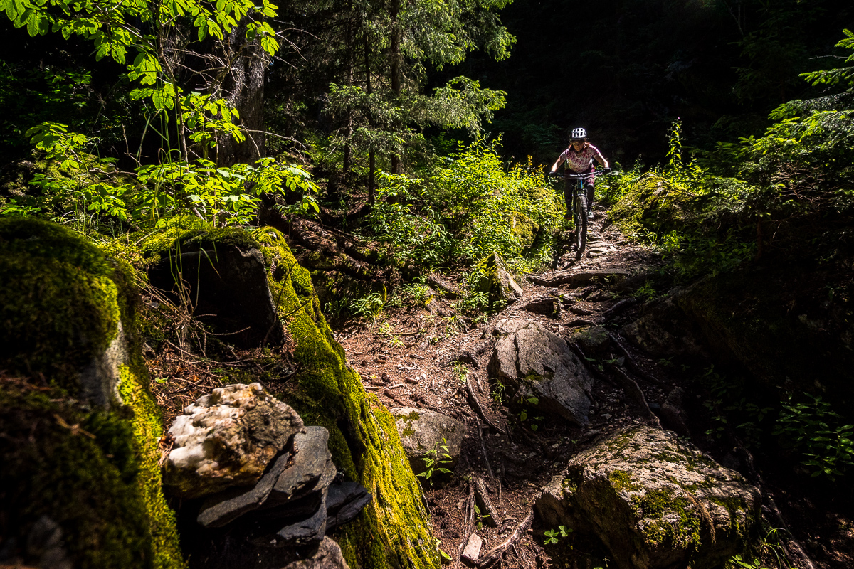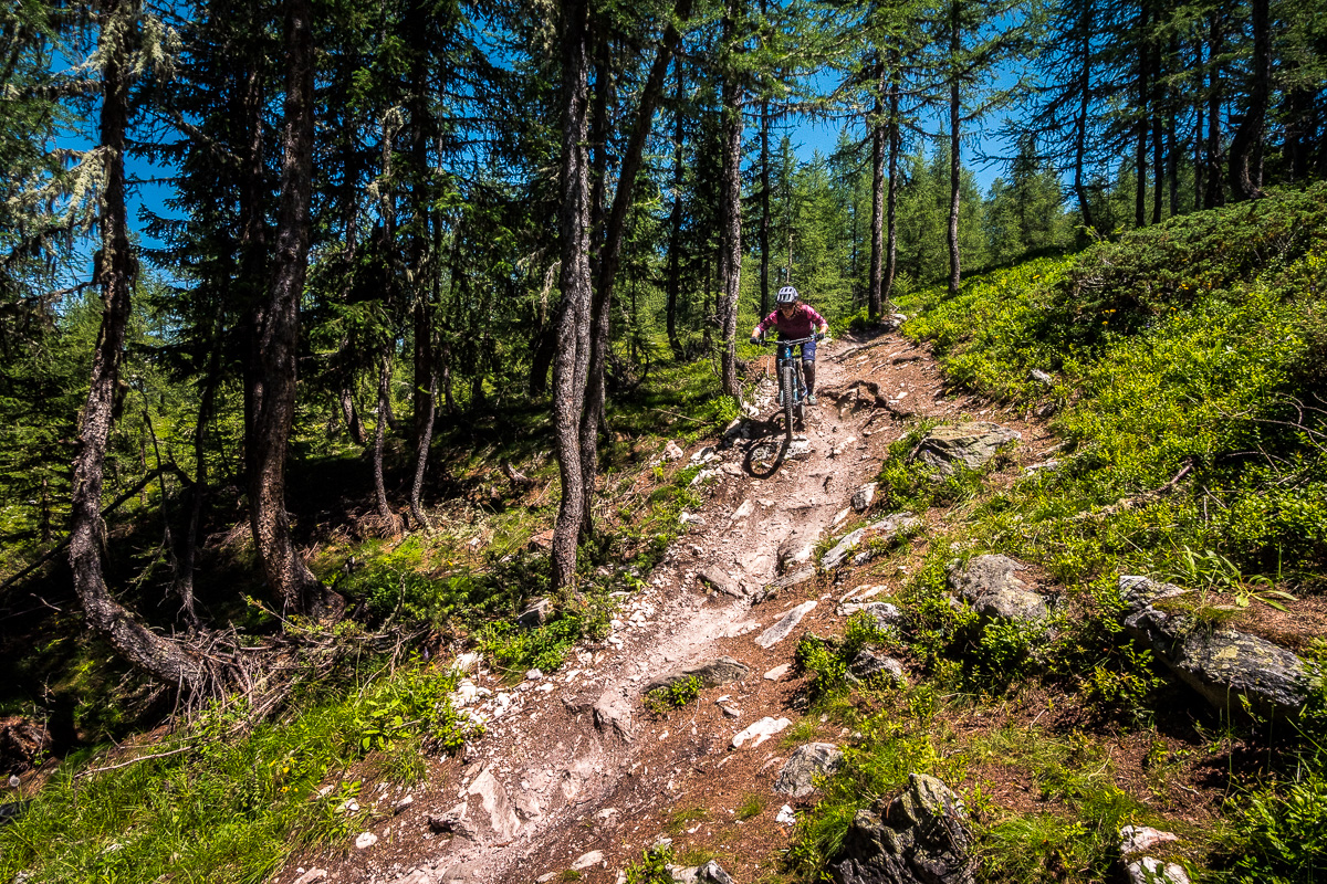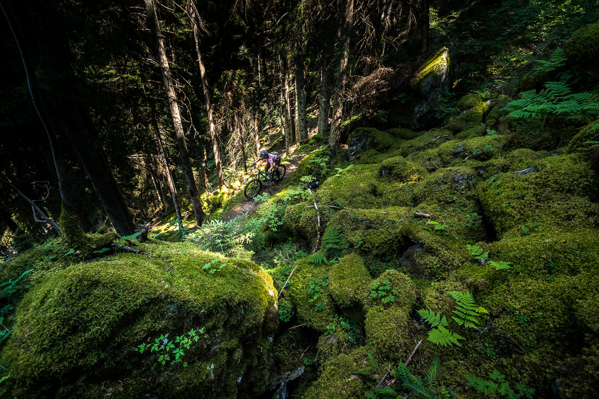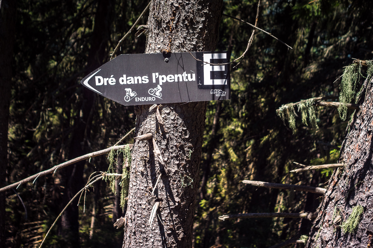 Hory pod Aguile Rouge majú ešte jednu stránku, čo robí Les Arcs šťavnatejším. Sú to neoficiálne /ilegálne/ prírodné enduro lajny a trailforks ich eviduje celkom dosť. Po dvoch dňoch v bikeparku sme cítili, že potrebujeme zmenu. A každý vie, že čo je ilegálne, to láka viac... K niektorým z trailov sa dá najlepšie prekľučkovať z oblasti Arc 1950. Pokiaľ si enduro pozitív rovnako ako my, Double Header je jasná voľba. Spočiatku nás trail uspáva – vlní sa po otvorenej lúke, vyzerá neškodne, skoro pohodovo. Ale akonáhle sa vnoríme medzi stromami, je všetko inak. Surová, neuhladená divočina plná koreňov, kameňov, prudkých pasáží a utiahnutých switchbackov.