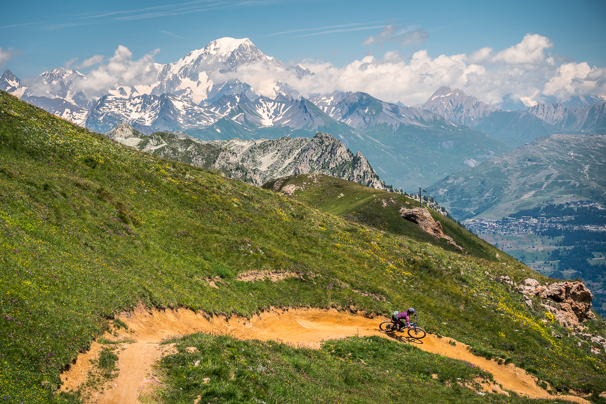 Les Arcs nie je len také hocijaké stredisko – je to miesto, kde vznikol jeden z prvých bikeparkov v Európe. Už koncom deväťdesiatych rokov tu postavili prvé oficiálne traily a odvtedy sa sieť neustále rozrastá. Člení sa do štyroch zón - a každá má iný vibe. Záleží, čo hľadáte - pokoj, akciu, luxus alebo výškové metre. Už samotné Bourg-Saint-Maurice je fajn voľba. Do Arc 1600 vás z neho behom pár minút vytiahne pozemná lanovka - funiculaire - a ste rovno v akcii. Arc 1600 je ideálny štart – pokojnejšia atmosféra, dobrý prístup k trailom a hlavne možnosť zísť to celé späť dole až do údolia. Kto chce byť v centre diania, zamieri do Arc 1800 – najväčšej a najživšej časti strediska. Bary, reštaurácie, obchody, hotely, všetko po ruke. Navyše výborná východisková pozícia pre väčšinu trás. Naopak Arc 1950 je luxusná záležitosť. Štýlové ubytovanie, drevo, kameň, horská romantika a ticho. MTB tratí tu síce veľmi nezačína, ale na regeneráciu a pohodlie top voľba. A potom je tu Arc 2000 - najvyššie položený sektor a východiskový bod pre tie najdlhšie a najťažšie zjazdy. Lanovkou sa odtiaľ dostanete až na Aiguille Rouge (3 226 m). Hore sa s bicyklom nesmie, ale rozhodne choďte - už kvôli výhľadom. Mont Blanc ako na dlani, k tomu panoráma Švajčiarska aj Talianska.